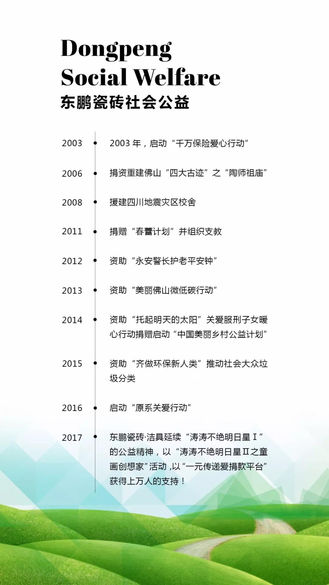 回顾近十年发展历程,东鹏积极践行社会责任,热心公益事业 樱花视频网站,自1999年出资赞助秋色巡游活动到2012年参与发起成立佛山公益慈善联盟,至今,东鹏公益慈善行动见证着东鹏践行社会责任的足迹: .